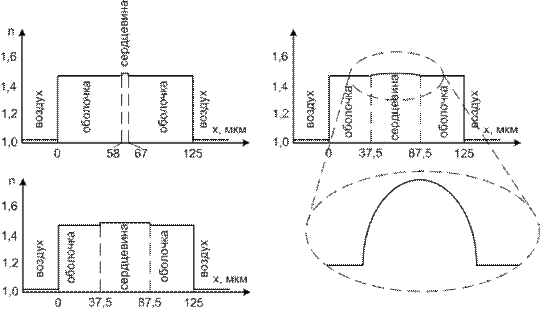 Профиль показателя преломления различных типов оптических волокон: слева вверху — одномодовое волокно, слева внизу — многомодовое ступенчатое волокно, справа — градиентное волокно с параболическим профилем.