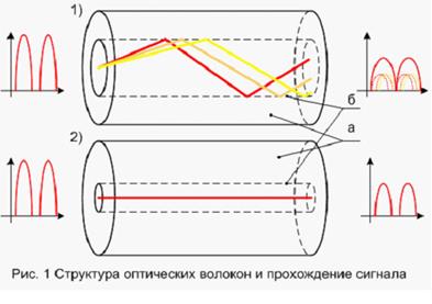 В названии типа волокна ест корень «модовое» и это не случайно. Чтобы понять, что такое «мода», вспомним принцип работы оптического волокна (рисунок 1). Сейчас мы не будем рассматривать множество защитных слоев, а рассмотрим только среду передачи. Оптическое волокно состоит из двух частей с различными коэффициентами преломления – сердцевины (б) nс и оболочки (а) nо. При nс> nо существует такой угол падения, при котором луч, проходящий через сердцевину волокна испытывает полное отражение от границы раздела с оболочкой. При размерах сердцевины, значительно больших, чем длина волны луча (рисунок 1 верхняя картинка), возможно множество траекторий (мод), а при диаметре сердцевины близких к длине волны – только одна (рисунок 1 нижняя картинка).