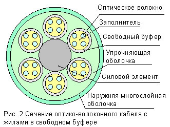 Волокно в кабеле со свободным буфером (рисунок 2) защищается базовым покрытием и располагается в достаточно жестком пластиковом модуле, имеющим значительный внутренний диаметр и заполненном гидрофобным гелем.