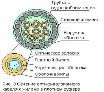 В кабелях с волокнами с плотным буфером (рисунок 3) защитный слой образуется путем непосредственного выдавливания пластика вокруг волокна. Такая конструкция имеет более высокую стойкость к растяжениям, ударам и сжатиям, а так же допускает изгибы значительно меньшего радиуса, чем кабели с волокнами в свободном буфере. Минусы данного типа кабелей – плохо переносит влажность и значительные температурные колебания, хотя стали появляться модели, лучше приспособленные к таким условиям. Кроме того, кабели такого типа имеют больший диаметр и вес.