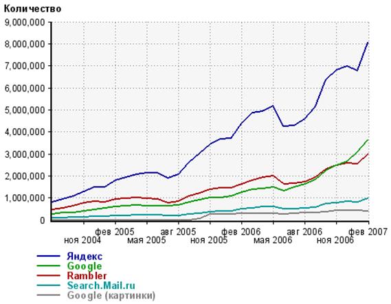 По данным, представленным в таблице поиска, можно анализировать эффективность каждой из представленных семи поисковых систем с точки зрения количества найденной информации, а именно сайтов, имеющихся в системе по отдельно заданному запросу. Анализ я осуществляла по следующему принципу: Учитывалась особенность поисковых систем по языковой принадлежности, анализ производился по 6-ти системам. В ходе анализа статистики мною были выявлены следующие закономерности: наибольшее количество сайтов по запросу на русском языке среди русскоязычных систем было выдано поисковыми системами Yandex и Google, при этом показатели Yandex значительно превышают Google, далее в порядке снижения эффективности следуют системы Aport, Rambler и MSN соответственно Yahoo, как англоязычная система, показала наихудший результат при поиске ключевых слов, заданных на русском языке. Таким образом, лидирующие позиции по показателям количества представленной информации занимают поисковые системы Yandex и Google и Aport.