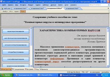 Учебное электронное пособие «Компьютерные вирусы и антивирусные программы» построено по блочно-модульному принципу в виде отдельных элементов или файлов, образующих логико-иерархическую структуру для организации соответствующего поискового аппарата, что позволяет достаточно легко дифференцировать разделы и темы пособия. (Рис. 5) В текстах установлены необходимые гипертекстовые связи, отражающие ключевые слова, термины, основные понятия, и т.п.