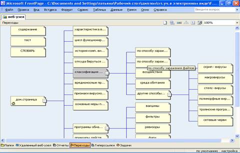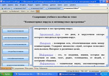 Таким образом, учебное электронное пособие по теме: «Компьютерные вирусы и антивирусные программы» представляет собой организованный многоуровневый гипертекст, позволяющий осуществлять изучение различных аспектов предмета с установлением разных логико-семантических отношений.