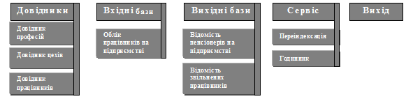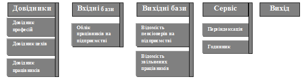 Вихідні відомості формуються з попереднім запитом у вікні про відділ у 1-й відомості, про період і прізвище у 2-й відомості. Вони виводяться в рапорті у вигляді документу формату А-4 з усіма полями, які присутні в оперативній базі даних (додатково оформити поля в 1-й і 2-й відомостях, які є довіднику працівників — особові дані). Назва програмних файлів, які обробляють бази даних однойменні з dbf-файлів. Вихід здійснюється в середовище операційної системи. До довідника працівників створити вікно для добавлення і зміни запису.