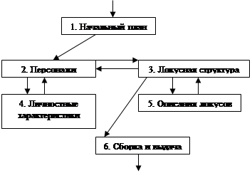 Работа программы начинается с первого блока, в котором выбирается тип сюжета сказки и ее персонажи. Здесь же формируется экспозиция сказки (setting). Во втором блоке хранятся описания, связанные с персонажами, а в четвертом - постоянные характеристики персонажей. Описания даются во фреймоподобных структурах представления знаний. С помощью второго и третьего блоков формируются мотивы и поступки персонажей. Третий блок задает последовательность движения персонажей по локусам. В последнем (шестом) блоке происходит сборка порожденных фрагментов сказки.