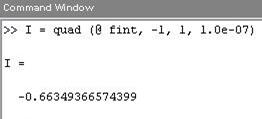 Для вычисления интеграла вызовем функцию quad, задав первым аргументом ссылку на функцию fint, а вторым и третьим — нижний и верхний пределы интегрирования.