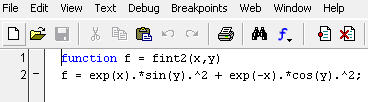 В MATLAB определена функция dblquad для приближенного вычисления двойных интегралов. Как и в случае вычисления определенных интегралов, следует написать файл-функцию для вычисления подынтегрального выражения. Вычислим интеграл:
