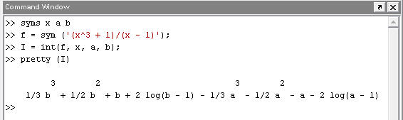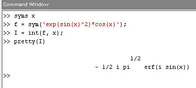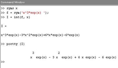 Symbolic Math Toolbox позволяет работать как с неопределенными интегралами, так и с определенными. Неопределенные интегралы от символьных функций вычисляются при помощи int, в качестве входных аргументов указываются символьная функция и переменная, по которой происходит интегрирование, например: