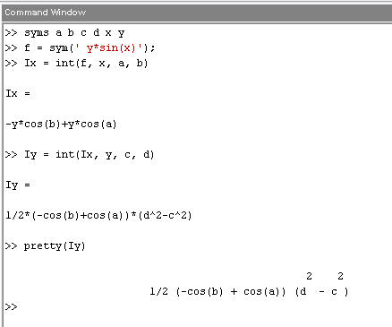 Определим символьные переменные а, b, с, d, x, у, подынтегральную функцию f от х и у и проинтегрируем сначала по х, а затем по у: