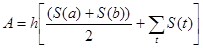Тогда площадь криволинейной трапеции, ограниченной линиями x=a, x=b, y=0, y=f(x), а значит (следуя из геометрического смысла), и значение нужного нам интеграла, приблизительно равна сумме площадей обычных трапеций с основаниями yi-1 и yi и высотой h=(b-a)/n, так как (если более привычно выражать для нас) h это Δx,a Δx=(b-a)/n при делении отрезка на n равных отрезков при помощи точек x0=a<x1<…<xn=b. Прямые x=xk разбивают криволинейную трапецию на n полосок. Принимая каждую из этих полосок за обыкновенную трапецию, получаем, что площадь криволинейной трапеции приблизительно равна сумме обыкновенных трапеций.