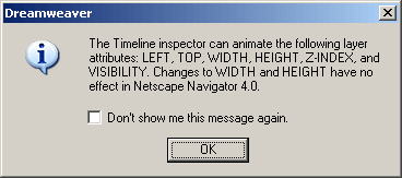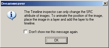 Теперь надо создать новую дорожку анимации для вновь созданного изображения. Выделяем его и выбераем пункт Add Object в контекстном меню панели Timelines (в контекстном меню графического изображения такого пункта нет). После этого Dreamweaver выведет очередное сообщение, предупреждающее, что он может управлять только параметром имени отображаемого файла (рисунок 14). Надо закрыть его, нажав кнопку ОК.