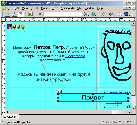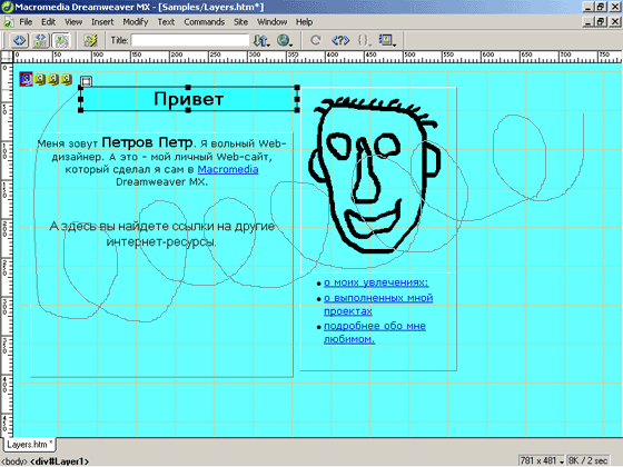 Знакомство с основными возможностями, предлагаемыми Dreamweaver для создания анимации завершено. Более сложные анимации, включающие в себя множество элементов, согласованно движущихся по разным траекториям, создаются аналогичным образом. Только тогда предстоит несколько больше работы по заданию траекторий, выставлению параметров в ключевых точках анимации и согласованию движения аними-рованных элементов.