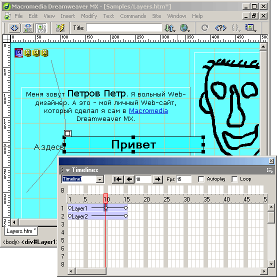 Dreamweaver помещает в буфер обмена не только дорожку анимации, но и свободно позиционируемый элемент, для которого она была создана, со всеми его параметрами и содержимым. И если вставить эту дорожку в другую страницу, которая уже содержит свободно позиционируемый элемент с таким же именем, Dreamweaver присваивает эту дорожку ему. Если же такого элемента на странице нет, он будет создан по образу и подобию скопированного.
