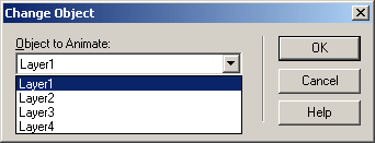 После того как вставили новую дорожку из буфера обмена, можно захотеть присвоить ее другому свободному элементу. Dreamweaver предоставляет и такую возможность. Выбераем пункт Change Object в контекстном меню или подменю Timeline меню Modify. После этого на экране появится диалоговое окно Change Object, показанное на рисунке 13. Выбераем нужный элемент в раскрывающемся списке Object to Animate и нажимаем кнопку ОК.