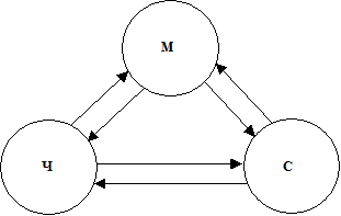 В настоящее время в технике для исследования работы машинных комплексов и машин используется понятие «человеко-машинной системы» (ЧМС), т.е. смешанной системы, составной частью которой наряду с техническими объектами является человек-оператор [13, 20]. Кроме того, ЧМС взаимодействует с окружающей средой. Таким образом, для моделирования ПТС необходимо рассматривать систему Человек-Машина-Среда, которая может быть отображена следующим графом (Рис. 1).
