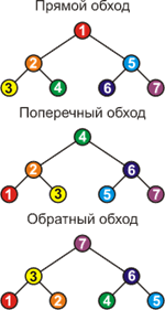 Есть три способа обхода: Прямой (preorder), Поперечный (inorder), Обратный (postorder).