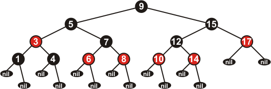 Пример КЧД с учётом наших положений приведен на рисунке 4. Учтите, что вершина 9 могла быть и красной, но в дальнейшем мы будем рассматривать только те деревья, у которых корень чёрный. Мы это сделаем для того, чтобы потомки корня могли иметь любой цвет.