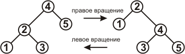 Операции вставки и удаления вершин в КЧД могут нарушать свойства КЧД. Чтобы восстановить эти свойства, надо будет перекрашивать некоторые вершины и менять структуру дерева. Для изменения структуры используются операции, называемые вращением. Возвращая КЧД его свойства, вращения так же восстанавливают сбалансированность дерева. Вращения бывают левые и правые, их суть показана на рисунке 5.