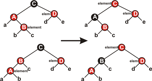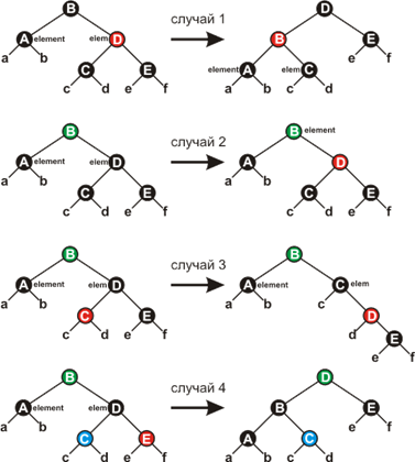 Внутри цикла node указывает на дважды чёрную вершину, а nodeTemp – на её брата (другую вершину с тем же родителем). Поскольку вершина node дважды чёрная, nodeTemp не может быть NIL, поскольку в этом случае вдоль одного пути от node.nodeParent было бы больше чёрных вершин, чем вдоль другого. Четыре возможных случая показаны на рисунке ниже. Зелёным и синим, помечены вершины, цвет которых не играет роли, то есть может быть как черным, так и красным, но сохраняется в процессе преобразований.