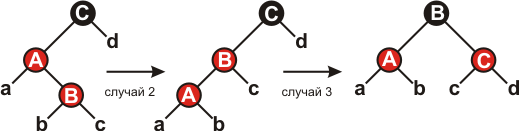 В случаях 2 и 3 вершина nodeTemp – чёрная. Различаются случаи, когда вершина node является правым или левым потомком своего родителя. Если правым, то это случай 2 (строки 20-23 и 41-45). В этом случае производится левое вращение, которое сводит случай 2 к случаю 3, когда node является левым потомком своего родителя. Так как node и node.nodeParent – красные, после вращения количество чёрных вершин на путях от корня к листьям остается прежним.