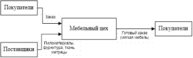 Как происходим взаимодействие предприятия с внешней средой? Покупатели делают заказ на производство конкретной модели мягкой мебели. Через 1-2 недели готовый заказ доставляется клиенту. Для снабжения производства всем необходимым мебельный цех закупает материалы, фурнитуру и матрацы на стороне у различных поставщиков. Все это мы отобразили в первой части функциональной модели предприятия.