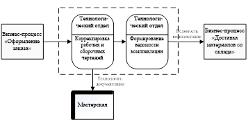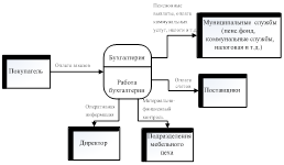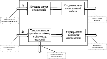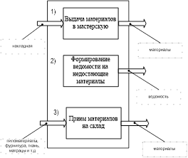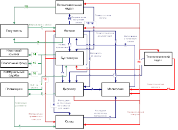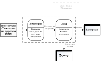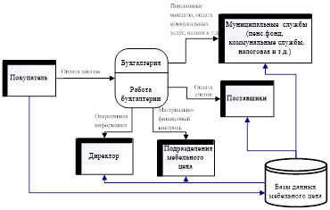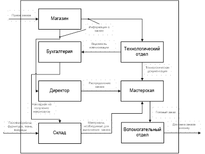 Теперь рассмотрим взаимодействие отделов предприятия в ходе производственной деятельности. Информация о полученном заказе передается директору, который прикрепляет его к конкретному мастеру, а так же в технологический отдел, где подготавливаются все технологические документы и ведомость комплектации. Технологическая документация передается в мастерскую, ведомость комплектации в бухгалтерию. Тут формируется накладная на получение необходимых материалов со склада. Материалы со склада поступают в мастерскую, где мастер приступает к выполнению заказа. Когда заказ готов, водитель цеха доставляет его заказчику. Все материалы, необходимые мебельному цеху, поступают от поставщиков на склад, а затем в мастерскую, где используются для создания мягкой мебели для конкретного заказа.