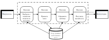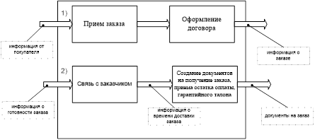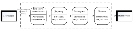 У цеха имеется небольшой магазинчик, в котором работают два продавца. В магазине представлены образцы типовых моделей мебели, которую производит цех. Продавцы принимают заказы на производство мебели от покупателей. Покупатель выбирает модель, расцветку обивки и комплектацию (существуют комплекты мебели – например, диван и два кресла в едином стиле, но покупатель может заказать только диван или диван и одно кресло). Продавец оформляет договор и принимает предоплату. Срок исполнения заказа – обычно одна-две недели.