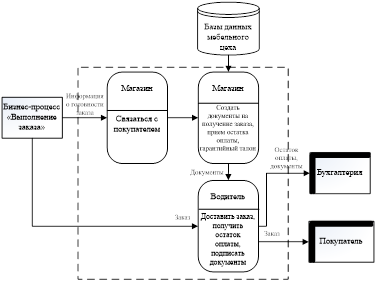 Когда заказ готов, продавец связывается с покупателем и договаривается о времени доставки. Затем создает гарантийный талон, документы на получение товара, прием оставшейся оплаты и передает их водителю. Водитель доставляет заказ клиенту, забирает оставшуюся часть оплаты заказа и подписывает документы у клиента. После доставки заказа водитель сдает документы и деньги бухгалтеру, который контролирует правильность расчетов и оформления.