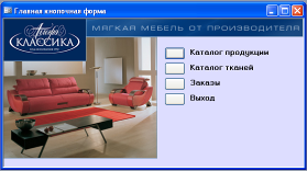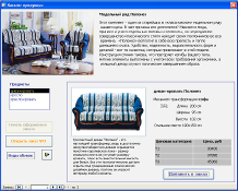 Перемещения между модельными рядами осуществляется с помощью кнопок перехода внизу формы. Чтобы увидеть, какие предметы входят в конкретный модельный ряд, создан список предметов. Покупатель может увидеть внешний вид предметов, их характеристики и цены. После выбора покупателем модели по вкусу, продавец может начать оформлять заказ. Для этого предназначена кнопка «Начать оформление заказа». После нажатия кнопка блокируется, и становятся доступными кнопки «Открыть заказ №», «Добавить в заказ» и «Виды обивок».