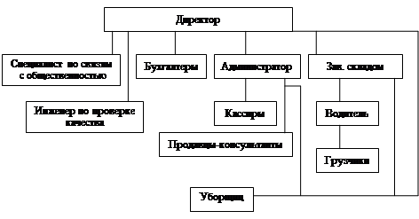 Штат сотрудников состоит из директора, 2-х бухгалтеров, кассиров, специалиста по связям с общественностью, продавцов-консультантов, грузчиков, водителя, уборщиц, заведующего складом, инженера по проверке качества продукции.