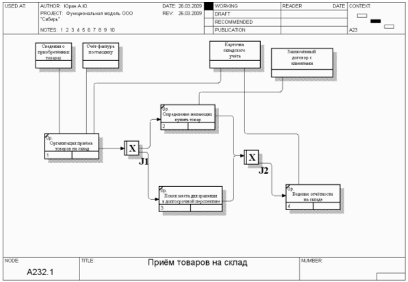 Получить товар. Имеет функцию - Учет поступившего товара с алгоритмом: 1) получить товар; 2) внести данные счета-фактуры поставщика в БД «Счета-фактуры»; 3) добавить изменения в карточку складского учёта; 4) внести отметку о надежности поставщика в БД «Поставщики».