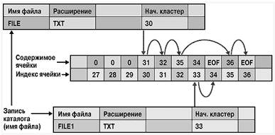 Следующая ступень организации хранения данных на жестком диске — FAT (File Allocation Table — таблица размещения файлов). Она, как правило, представлена в двух экземплярах, следующих друг за другом и содержащих одинаковую информацию (при условии, что все в порядке). Нужно помнить, что операционные системы DOS и Windows не различают цилиндры, головки и физические секторы диска, который для этих ОС предстает в виде непрерывной последовательности логических секторов или кластеров (группы смежных секторов). Система MS-DOS до версии 7.0 включительно и система Windows могли распознать 65 536 логических блоков на диске. Начиная с Windows 95 OSR2, появилась возможность использовать для нумерации логических элементов на диске 32-разрядные данные, а значит, число адресуемых элементов теоретически возросло до 4 294 967 295. Для DOS до версии 3.х включительно размер логического блока равнялся 512 байтам, т. е. размеру физического сектора. Видимо, поэтому появилось понятие «логический сектор», используемое и поныне. Наибольшая емкость диска, с которым могла работать DOS, составляла 32 Мбайт. Но был найден выход: объединять логические секторы в группы — так называемые кластеры. Под этим термином понимается группа таких смежных секторов, которым соответствует одно значение адреса. Если увеличить размер кластера, то можно будет работать с большими разделами, оставаясь в рамках 16-разрядной адресации. После перехода к 32-разрядной адресации стало возможным (правда, лишь теоретически) применять кластеры любого размера на любых разделах.