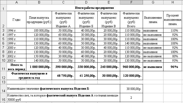 3. В ячейке F15 рассчитать количество лет, за которые фактический выпуск Изделия А составил меньше 50000 руб.