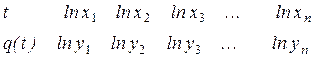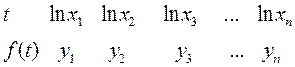 Итак, для нахождения приближающей функции в виде (6) нужно прологарифмировать значения функции в исходной таблице 1 и, рассматривая их совместно с исходными значениями аргумента, построить для новой таблицы 3 приближающую функцию вида (8).
