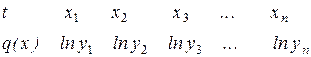 Покажем, как нахождение приближающей функции в виде геометрической регрессии может быть сведено к нахождению параметров линейной функции. Предполагая, что в исходной таблице 1 значения аргумента и функции положительны, прологарифмируем равенство (3) при условии ![]()
