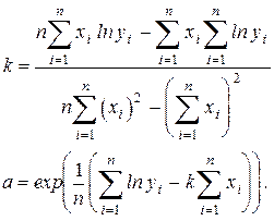 Таким образом приближающая показательная функция нехитрыми преобразованиями сведена к линейной, следовательно, для определения коэффициентов