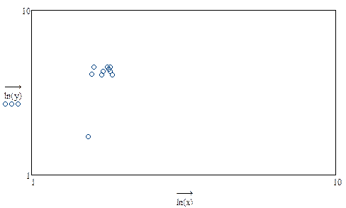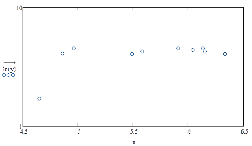 Можно заметить что на рисунке 7 точки приближенно укладываются в прямую линию. Это означает что подбираемую функцию можно линеаризовать, если заменить вектор у на ln(у).