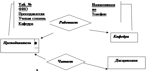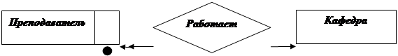 В нашей работе степень связи 1:N будет соответствовать предположению, что на одной кафедре может быть множество преподавателей. Обязательный класс принадлежности для сущности «Преподаватель» означает, что за каждым преподавателем обязательно закреплена одна кафедра. Приведем E-R диаграмму для этого случая.