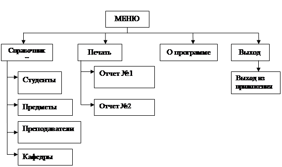 Интерфейс состоит из двух уровней. На первом из них предоставляется доступ к одной из четырех справочников – «Студенты», «Предметы», «Преподаватели» либо «Кафедры». Для доступа к этим справочникам используется экранная форма (см. Приложение 2), в которой отображается содержимое справочника в виде таблицы. На форме размещены специальные кнопки для редактирования, добавления и удаления записи. При нажатии на кнопку «Редактировать» открывается окно (см. Приложение 2), в котором содержатся поля для редактирования. Кнопка «Добавить» добавляет строку в таблицу, а кнопка «Удалить» соответственно удаляет запись.