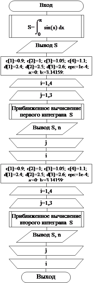 eps=1e-4(точность), в параметр n, по выходе из функции вычисления интеграла будет записано число итераций}
