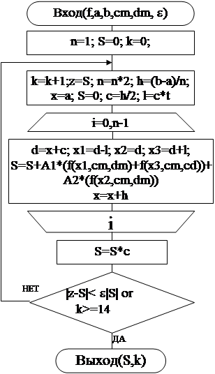 a,b- пределы интегрирования, cm,dm-параметры c и d функции f, eps -точность вычислений