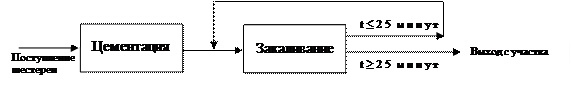 На участке термической обработки выполняются цементация и закаливание шестерен, поступающих через 10 + 5 мин. Цементация занимает 10 + 7 мин., закаливание - 10 + 6 мин. Качество определяется суммарным временем обработки. Шестерни с временем обработки больше 25 мин. покидают участок, с временем обработки до 25 мин. передаются на повторную закалку.