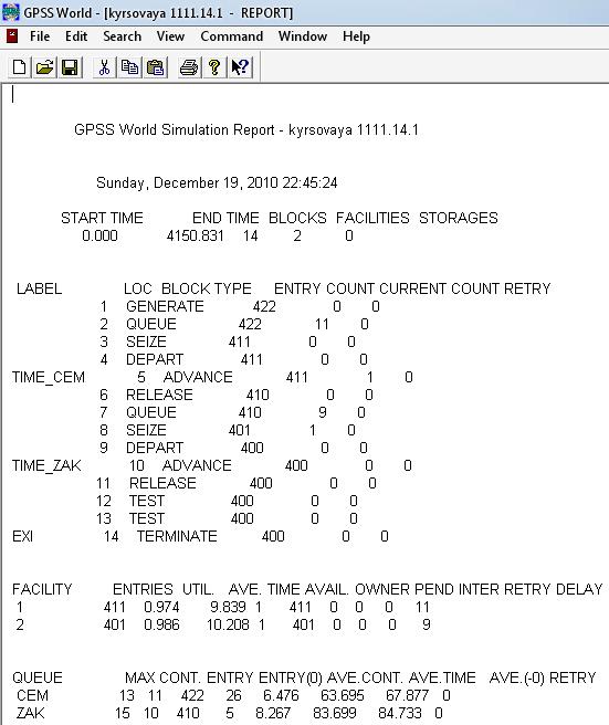 Еще ниже указываются результаты моделирования агрегата (QUEUE) под присвоенными нами именами соответственно CEM и ZAK