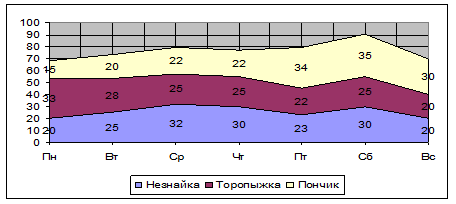 Областная диаграмма или диаграмма площадей – гибрид ярусной диаграммы с линейной. Позволяет одновременно проследить изменение каждой из нескольких величин и изменение их суммы в нескольких точках. (Рис.5)