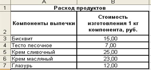 4. На рабочем листе Расход MSExcel создать таблицу данных о стоимости компонентов выпечных изделий.