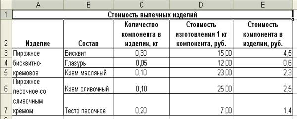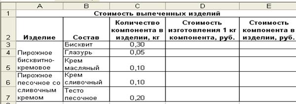 9. Заполнить таблицу «Стоимость выпечных изделий» исходными данными (рис. 5.).