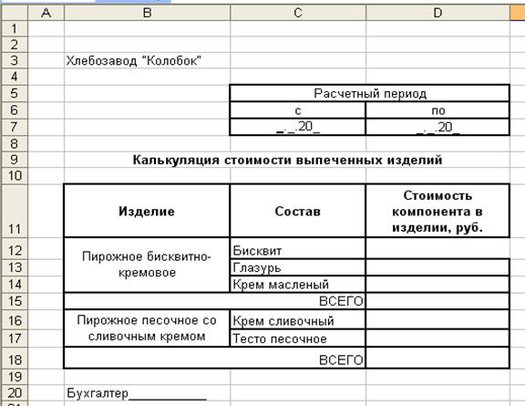 Рис.8. Расположение формы калькуляции стоимости выпечных изделий на рабочем листе Калькуляция MSExcel