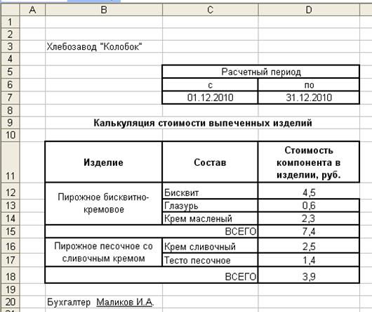 Цель решения задачи: состоит в том, чтобы произвести расчет стоимости компонентов выпечных изделий, предоставить их в виде таблицы, а также в графическом виде. Сформировать и заполнить форму калькуляции стоимости выпечных изделий.