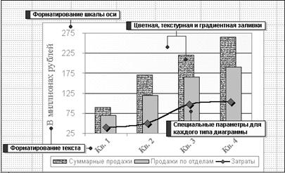 В различных типах диаграмм имеются особые строки, панели, маркеры данных и другие параметры. Например, для столбца и для гистограммы можно добиться эффекта наслоения путем изменения свойства перекрытия для рядов данных. Восновном примере за каждым маркером на графике, имеющем форму ромба, есть тень и используются плавные линии.
