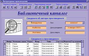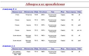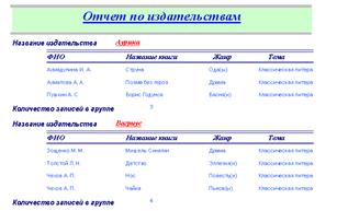 - вывод данных (просмотр записей библиотечного каталога и получение информации о книге, её авторе и издательстве, в котором она была издана; просмотр отчетов обо всех имеющихся в библиотеке книгах данного автора и о количестве книг, изданных каждым издательством) на экран и печать отчетов.